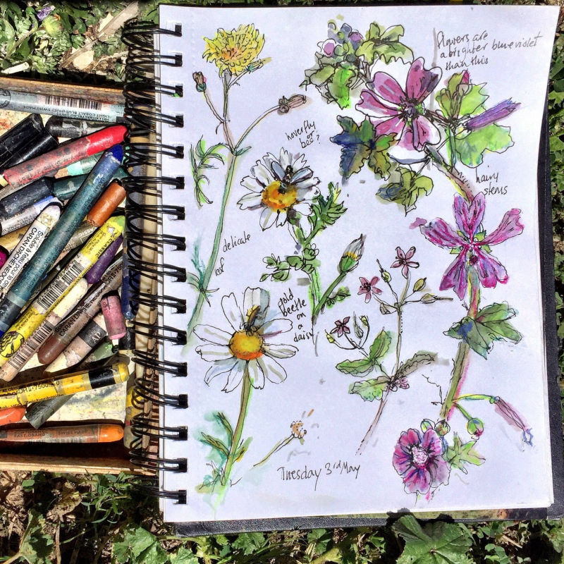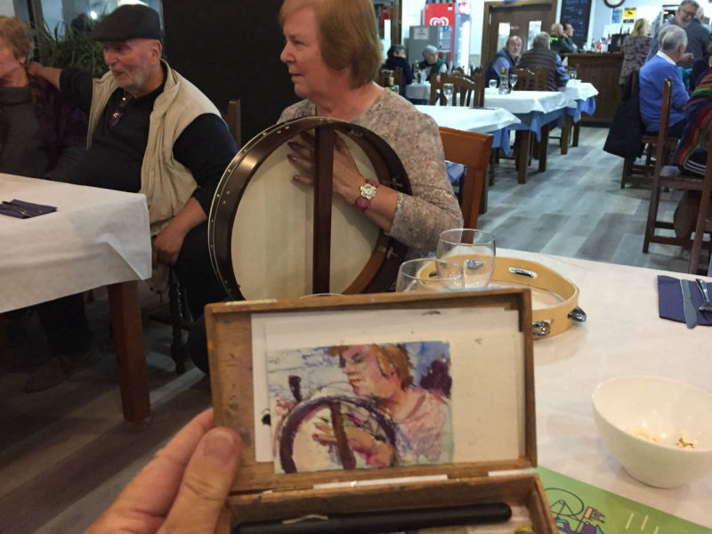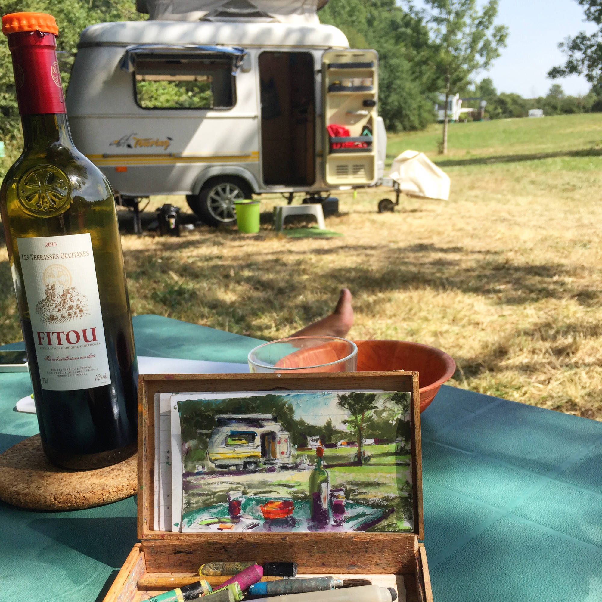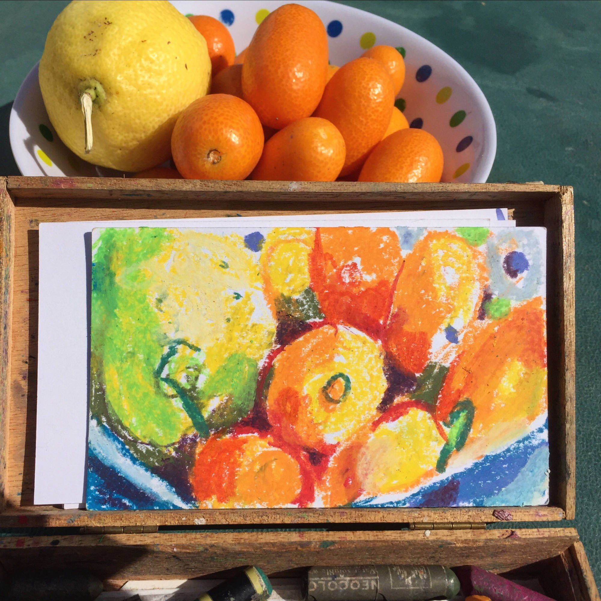 A small wooden cigar box has become my studio.It holds my sketch crayons, brush and art cards ready for use as I travel.The ingredients change but my box stays with me.